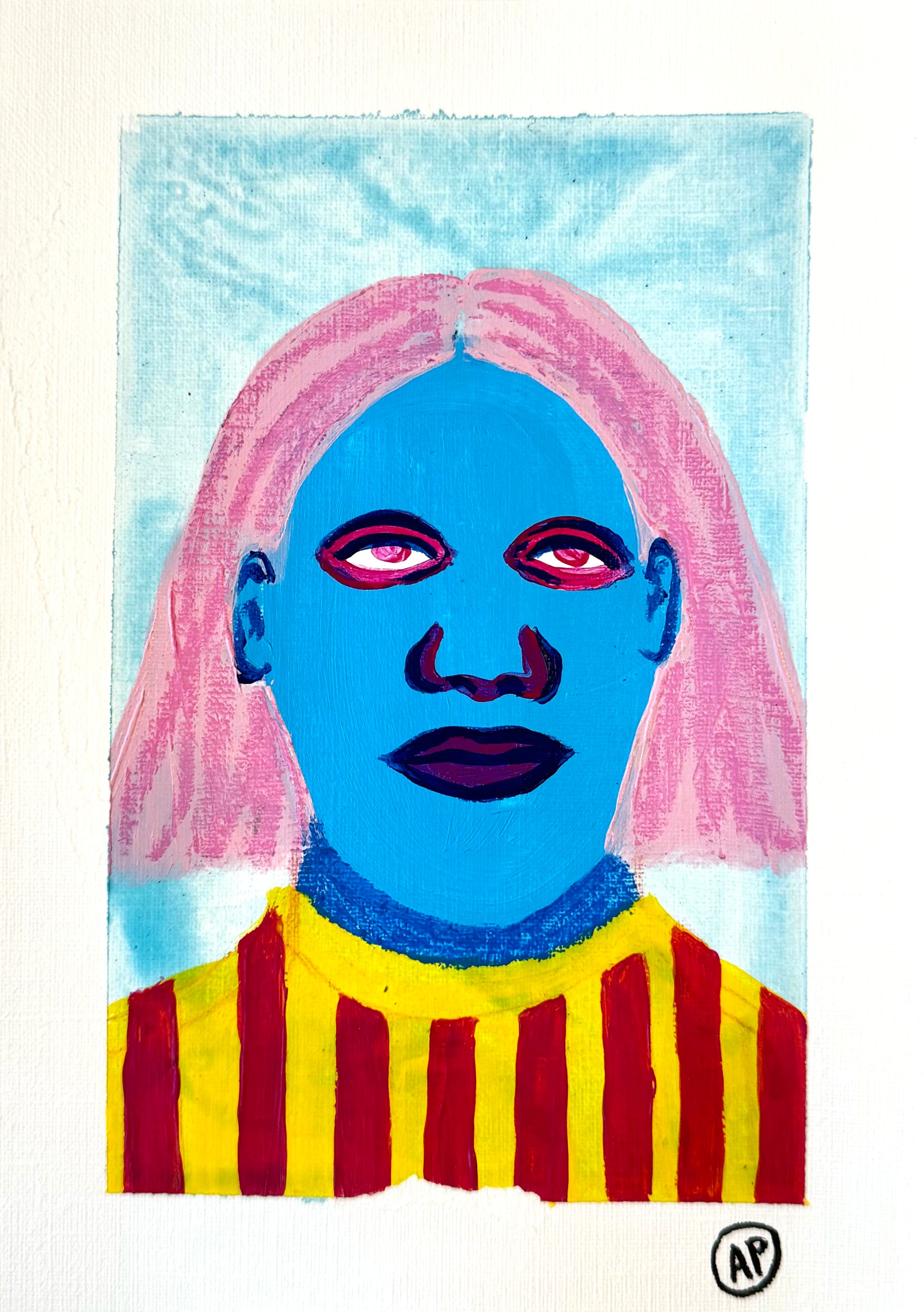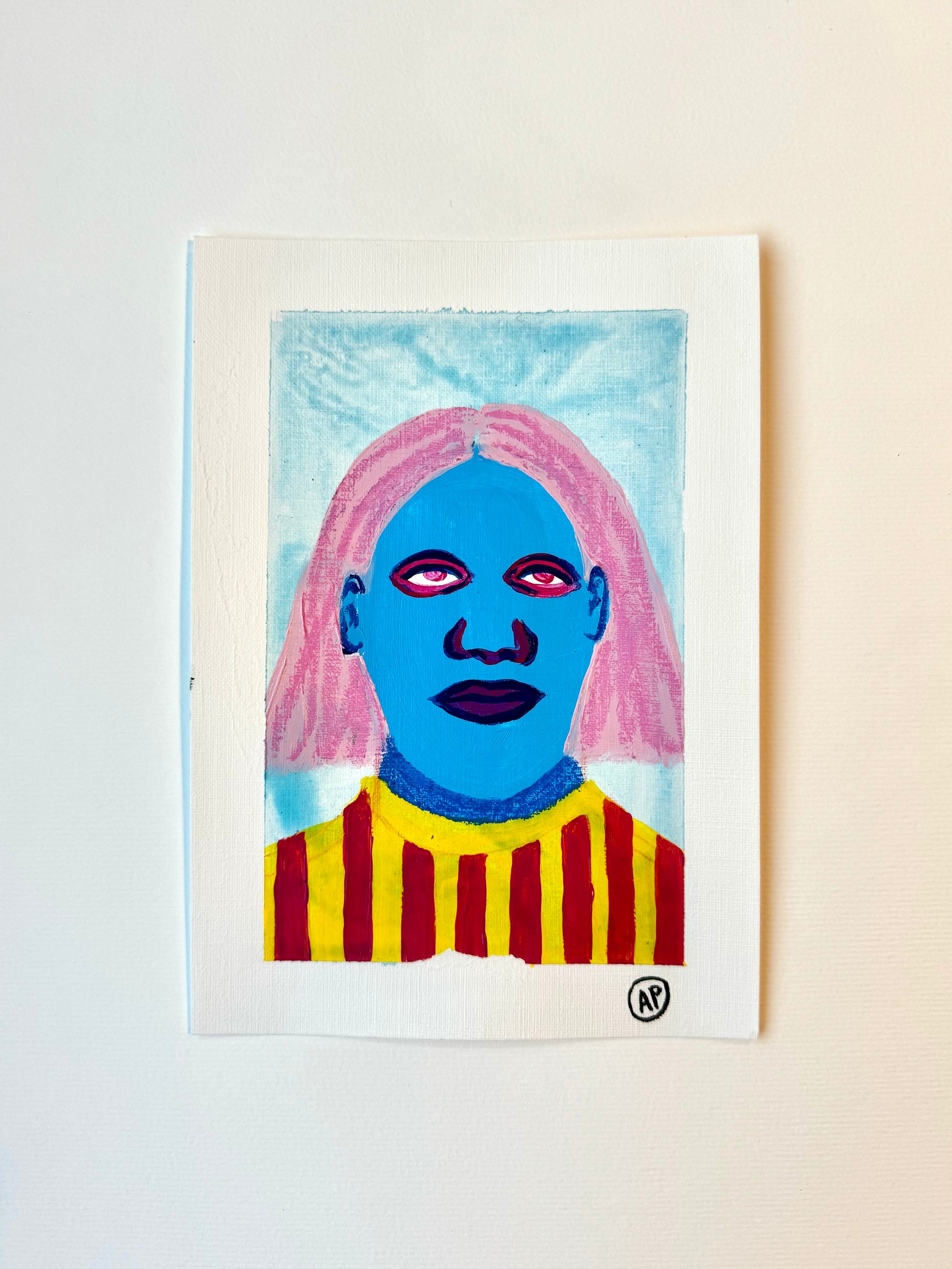 Bold, colorful, and full of personality, this A5 original painting brings a unique touch to any space. Hand-painted on high-quality paper, it combines vivid colors with a modern, stylized portrait design, creating a visually striking piece that stands out. Each portrait features playful contrasts and intricate patterns, capturing a sense of individuality and artistic flair.