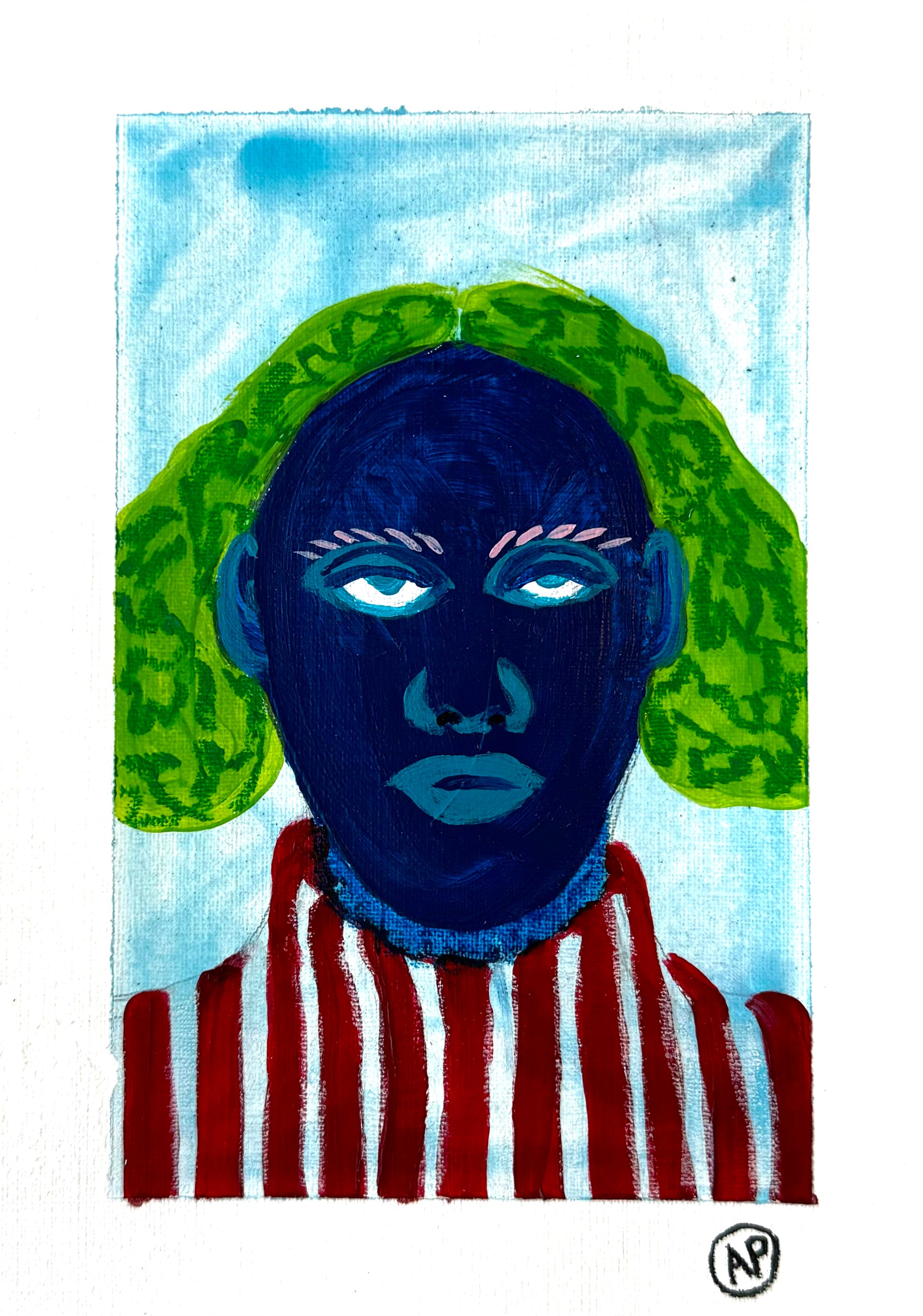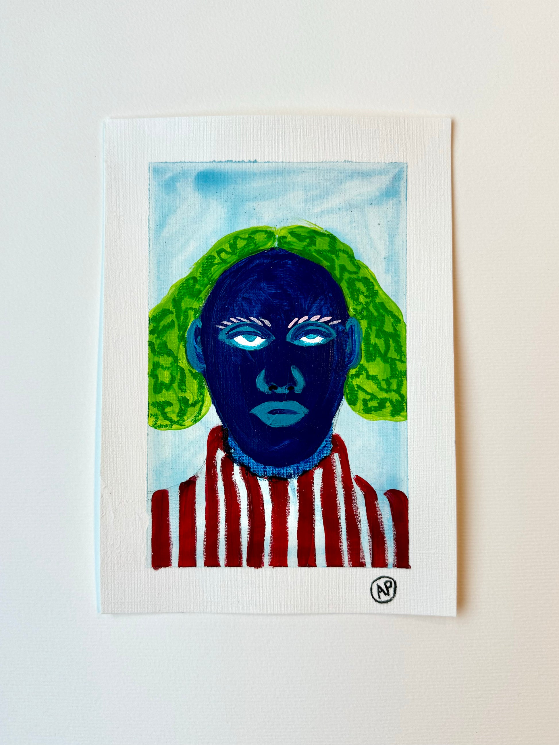 Bold, colorful, and full of personality, this A5 original painting brings a unique touch to any space. Hand-painted on high-quality paper, it combines vivid colors with a modern, stylized portrait design, creating a visually striking piece that stands out. Each portrait features playful contrasts and intricate patterns, capturing a sense of individuality and artistic flair.