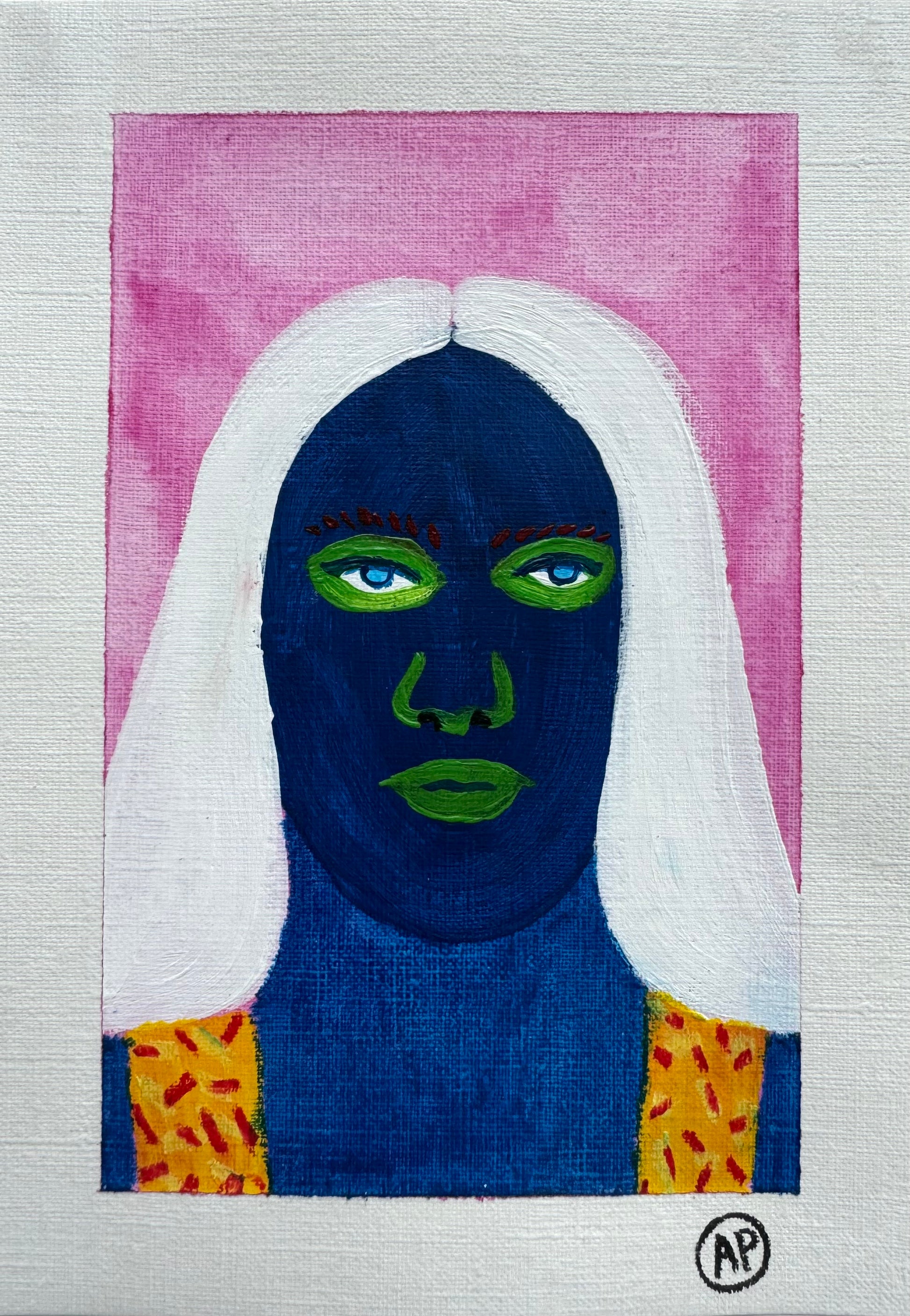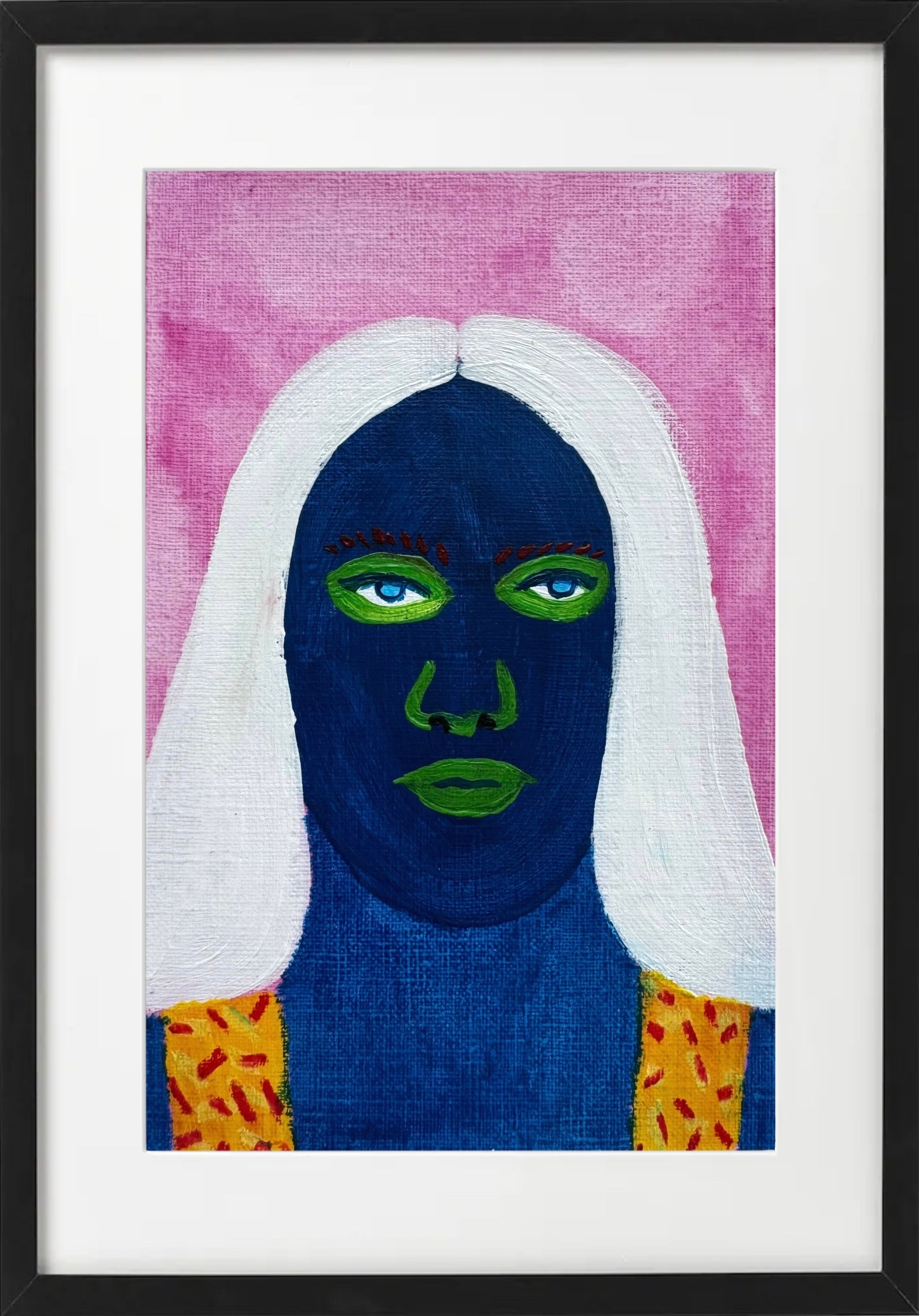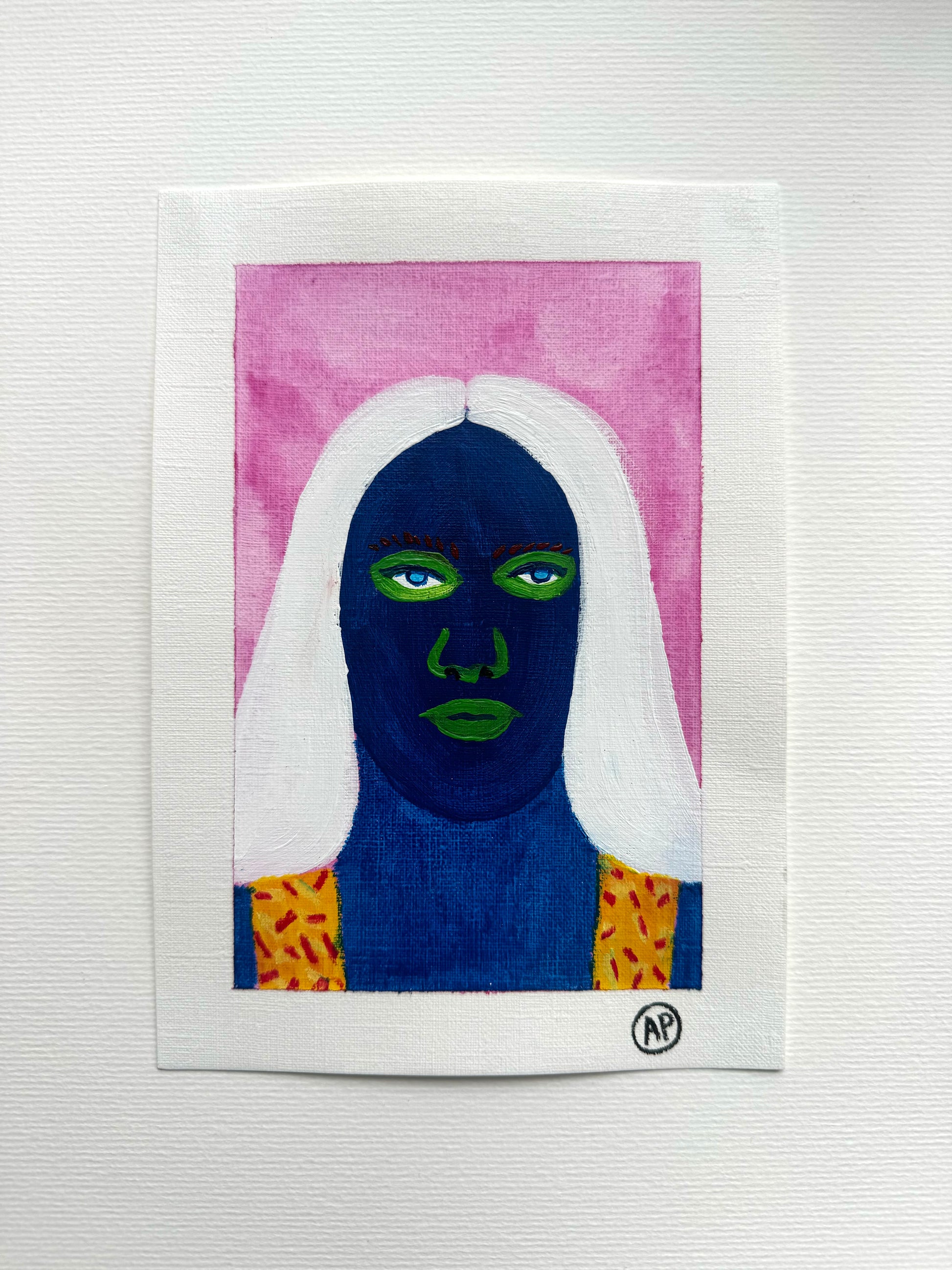 Bold, colorful, and full of personality, this A5 original painting brings a unique touch to any space. Hand-painted on high-quality paper, it combines vivid colors with a modern, stylized portrait design, creating a visually striking piece that stands out. Each portrait features playful contrasts and intricate patterns, capturing a sense of individuality and artistic flair.