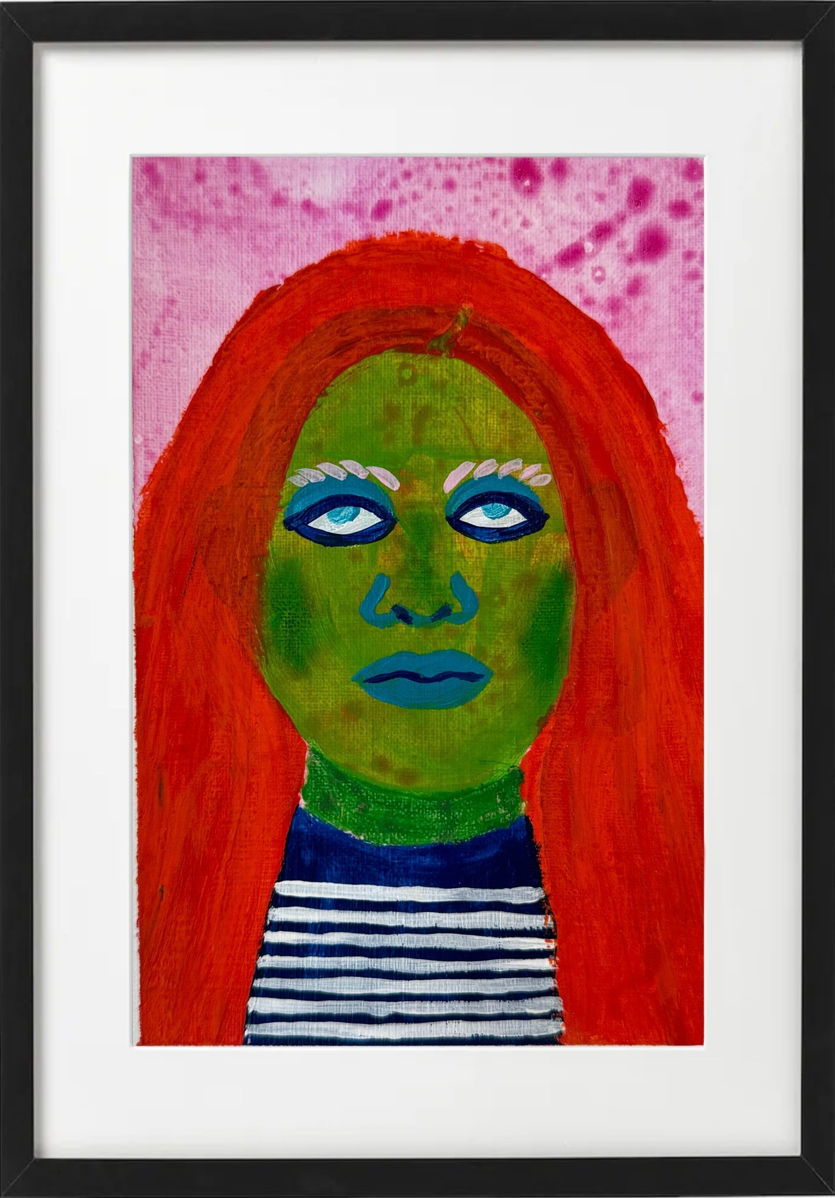 Bold, colorful, and full of personality, this A5 original painting brings a unique touch to any space. Hand-painted on high-quality paper, it combines vivid colors with a modern, stylized portrait design, creating a visually striking piece that stands out. Each portrait features playful contrasts and intricate patterns, capturing a sense of individuality and artistic flair.